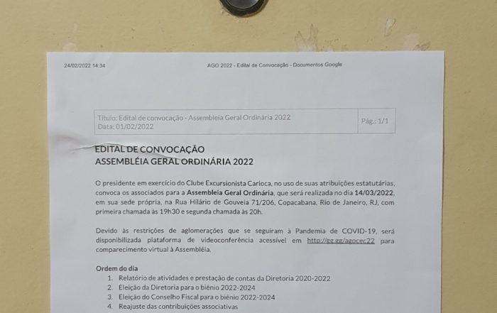 EDITAL DE CONVOCAÇÃO ASSEMBLÉIA GERAL ORDINÁRIA 2022 O presidente em exercício do Clube Excursionista Carioca, no uso de suas [...]